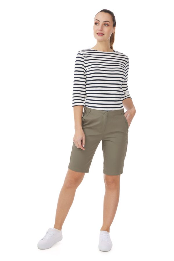 Élégant par sa longueur et la douceur de son coton élasthanne, voilà le bermuda chic des beaux jours. Il se distingue par ses boutons aux poches inspirés des pantalons à pont portés par les marins. Pratique avec sa fermeture à zip et boutons, ce bermuda à pont présente une bonne tenue et s’associe bien à la marinière Marina. On apprécie son confort et ses couleurs toujours aussi vives dans la veine Mousqueton !