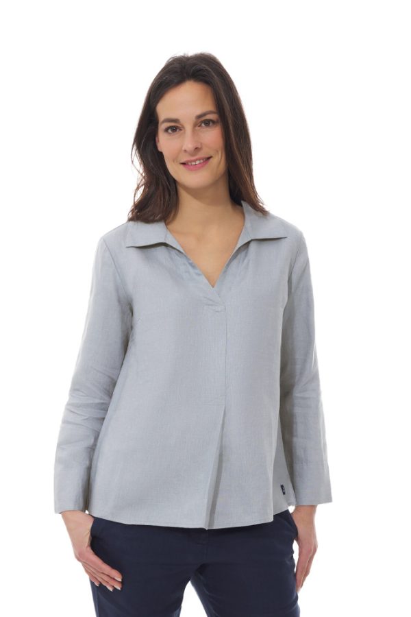 – Effet croisé sur le bas de la blouse à l’avant grâce à un pli plat.