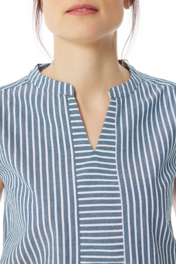 Démarquez-vous avec cette blouse rayée à manches courtes ! Les rayures verticales et le nœud à la taille donnent à ce modèle un style vintage très féminin. Avec sa matière respirante en chambray et et ses manches courtes, c’est le haut idéal pour une balade ensoleillée le long de la plage.
