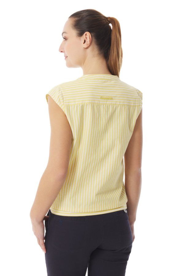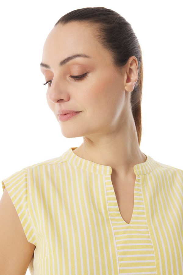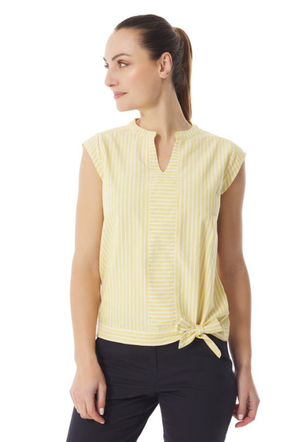 Démarquez-vous avec cette blouse rayée à manches courtes ! Les rayures verticales et le nœud à la taille donnent à ce modèle un style vintage très féminin. Avec sa matière respirante en chambray et et ses manches courtes, c’est le haut idéal pour une balade ensoleillée le long de la plage.
