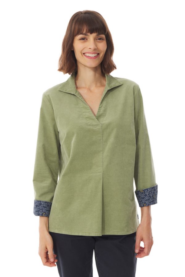 Poignets fendus pour réaliser de jolis revers. Revers à motifs. Effet croisé sur le bas de la blouse à l’avant grâce à un pli plat. Etiquette Mousqueton bas gauche.