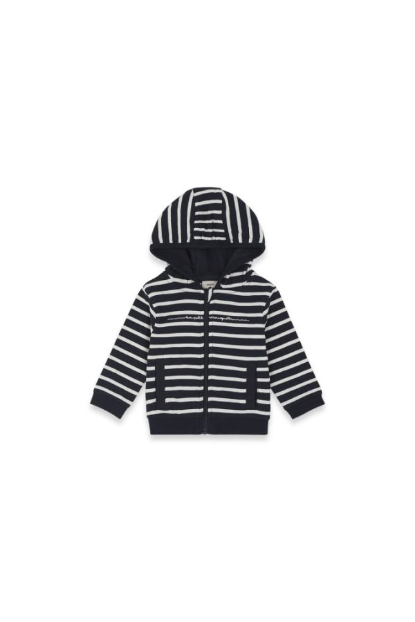 Gilet bébé rayé et zippé à capuche et en coton bio.