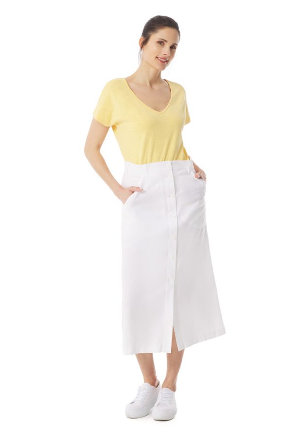 Craquez pour cette jupe longue en ramie ! Equipée de grandes poches et boutonnée à l’avant, elle se veut à la fois pratique et tendance. La simplicité de cette jupe longue boutonnée s’accorde à merveille aux rayures d’un t-shirt léger. Petit plus : sa matière en ramie et en coton, solide et respirante, apporte un look naturel au vêtement.