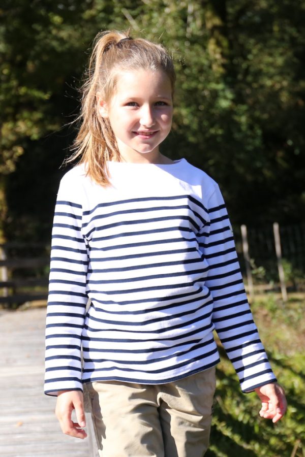 Marinière mixte enfant à manches longues et rayures placées.