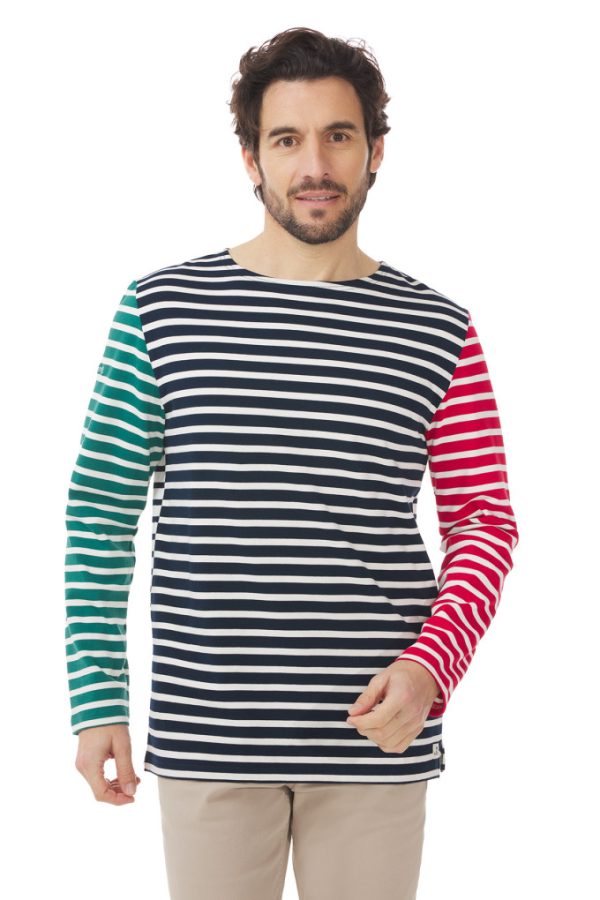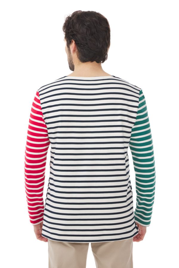Nous avons choisi de combiner deux idées pour cette marinière homme : le « positif-négatif » avec le jeu de rayures inversées à l’avant et à l’arrière, et le « bâbord-tribord » avec une manche rouge à gauche et une manche verte à droite.