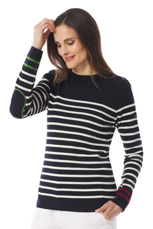 Et pourquoi ne pas ajouter un nouveau pull marin à votre collection ? Nul doute, ce modèle ne ressemble à un aucun autre ! Ses rayures aux couleurs bâbord-tribord vont feront chavirer jusqu’aux îles bretonnes. Une création originale au style unique et féminin qui vous apportera chaleur et confort.