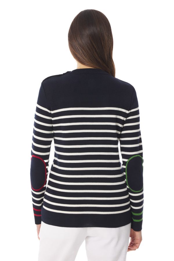 Pull marin rayé et boutonné avec jeu de rayures et coudières bâbord-tribord.