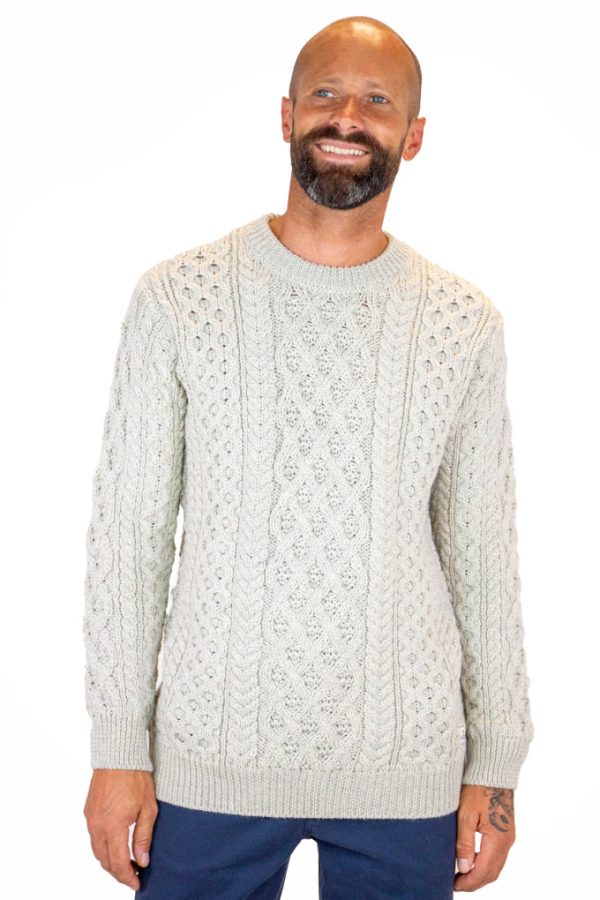 Fabriqué aux îles d’Aran situées au large de la côte ouest irlandaise, ce pull est conçu dans la pure tradition artisanale.