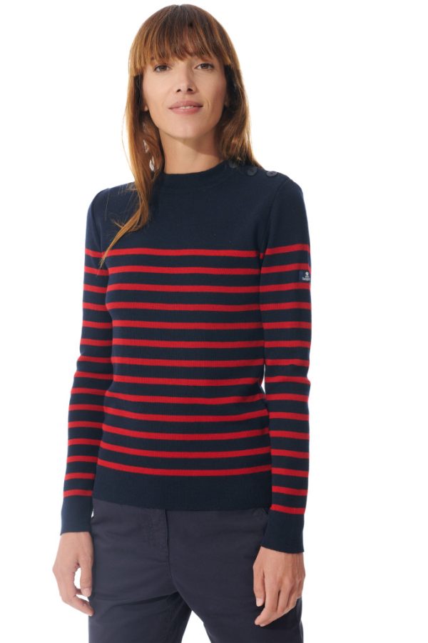 Cet incontournable pull marin vous offre confort et chaleur avec son mélange laine-acrylique. Son col rond et ses trois boutons placés sur l’épaule amplifieront le caractère marin de vos looks. Vous apprécierez sa coupe légèrement ajustée qui valorise la silhouette et donne une allure très féminine.