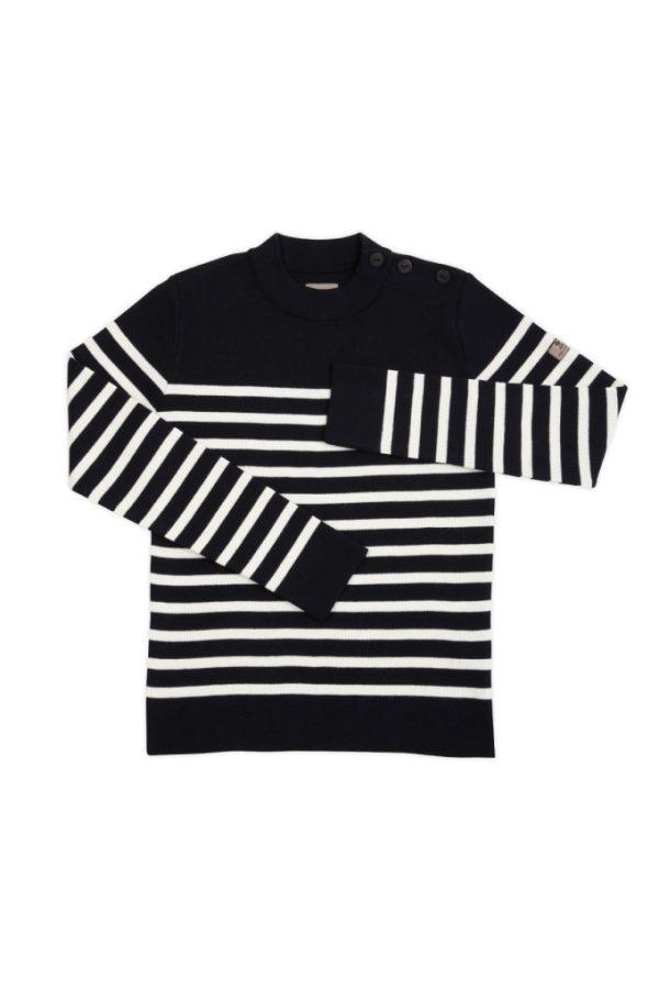 Pull marin mixte rayé avec boutonnage épaule gauche.