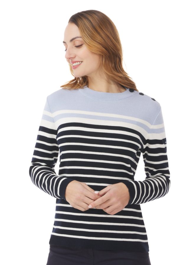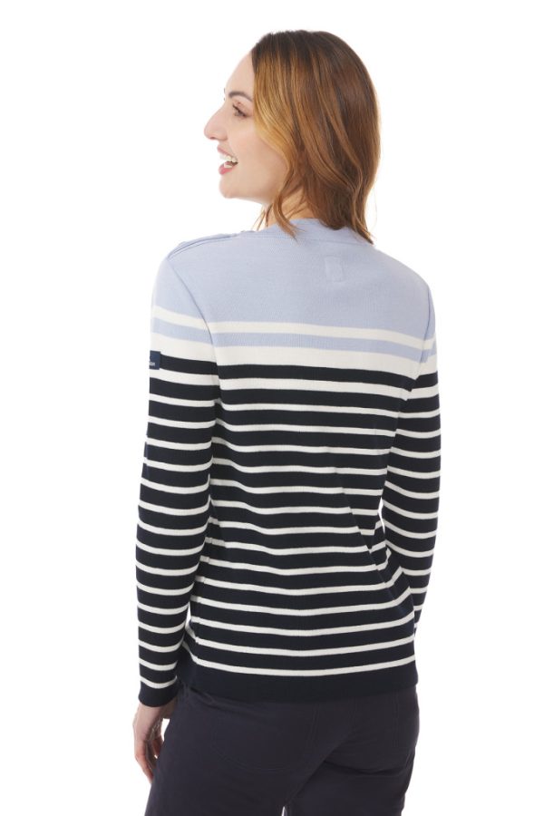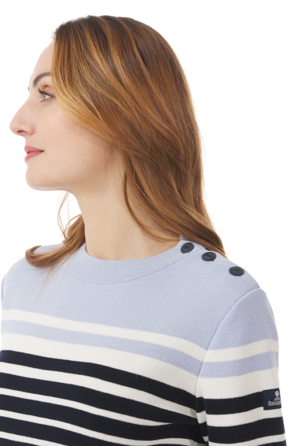 Mousqueton revisite le pull marin avec authenticité et modernité. Le modèle Morgat se décline avec ses rayures placées très originales et ses 3 couleurs. En composition laine-acrylique, cet indémodable saura vous réchauffer tout en style et en douceur.