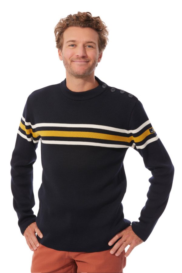 Dans le pur esprit d’un authentique pull marin, le modèle Tim se distingue avec ses 3 rayures originales.