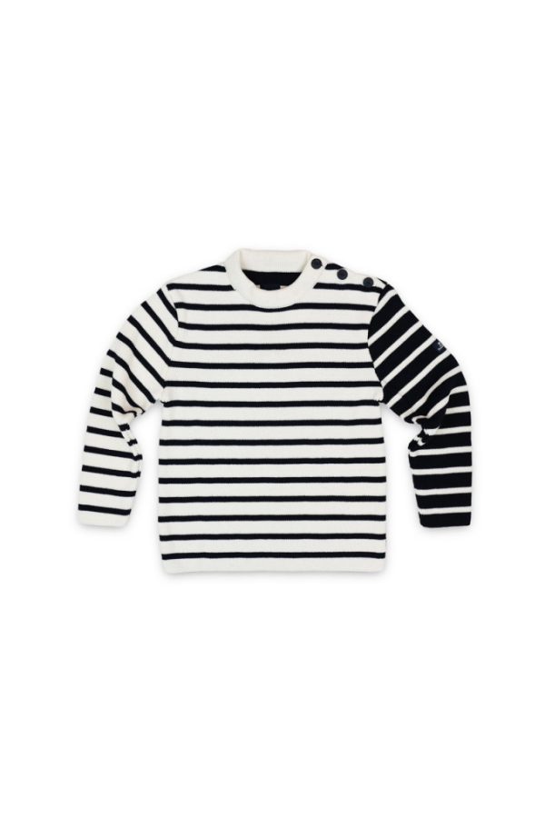 Pull marin boutonné enfant avec jeu de rayures inversées.