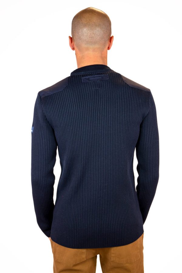 Nous avons souhaité conserver un héritage marin avec ce pull dans l’esprit officier de la Marine Nationale. Ses empiècements aux épaules servaient de renforts montrant ainsi les conditions difficiles du métier.
