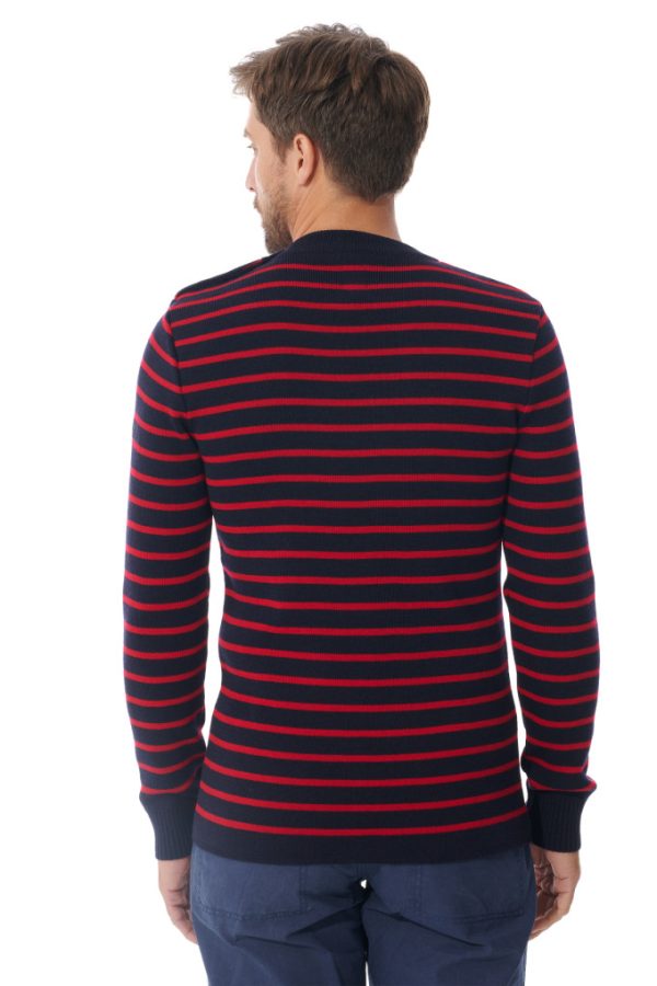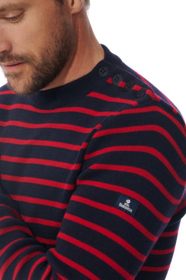 Mousqueton complète sa gamme 100% laine et vous propose cette version rayée du pull Morbihan, fabriquée en France. Pièce incontournable du vestiaire marin, le pull homme en laine est ici décliné dans sa version traditionnelle : côte resserrée aux poignets, boutons ancre, col rond et coupe près du corps.