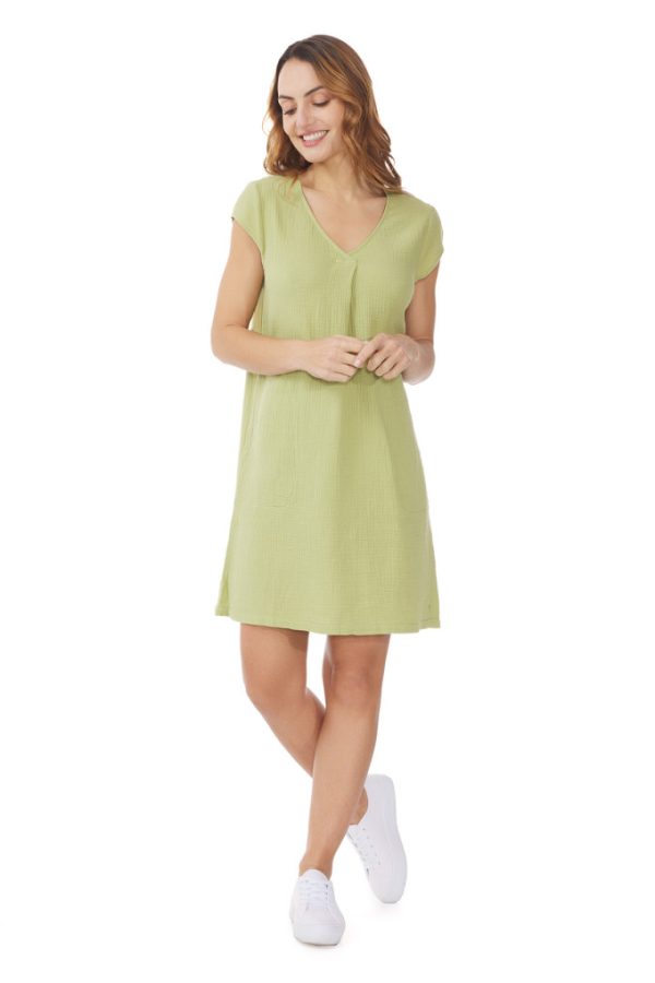 Coupe empire légèrement évasée. Manches courtes. Décolleté en V.