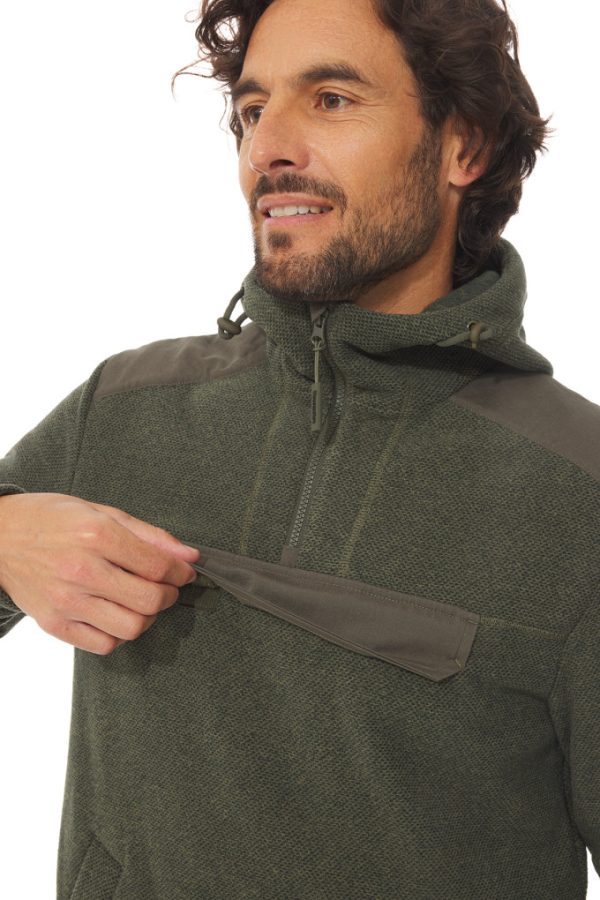 Col zippé avec patte de protection intérieure et tirette en caoutchouc. Grande poche poitrine à rabat avec fermeture velcro. Grande poche ventrale avec deux ouvertures sur les côtés Doublure des poches en polaire. Logo Mousqueton sur la manche gauche. Empiècements en toile légère sur les épaules et le dos.