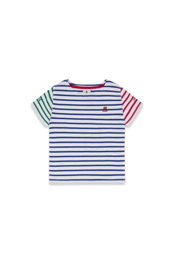 T-shirt rayé enfant manches courtes avec rayures contrastées en coton bio.