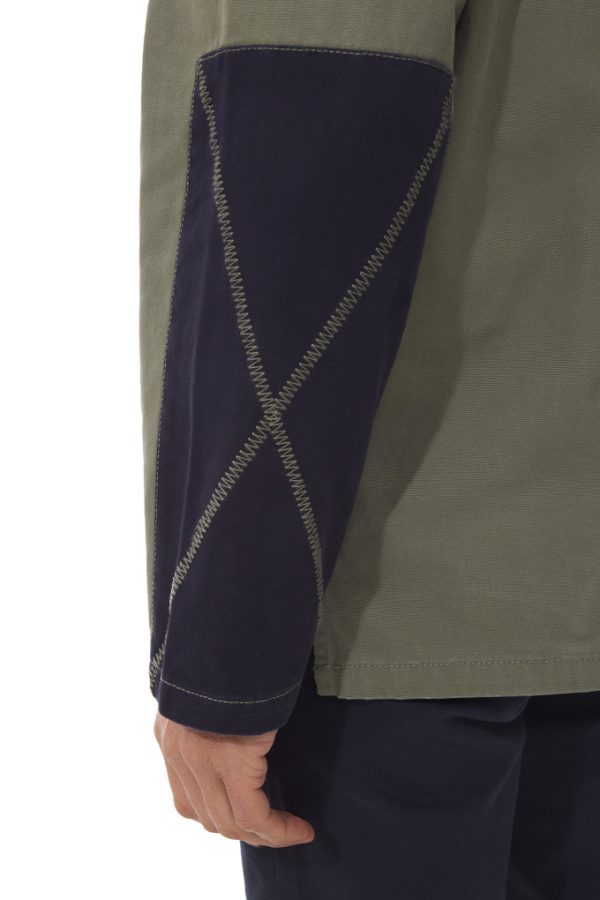 Emmanchures et coutures côtés renforcées par double sur-piquage. Fentes côtés. Coudières de couleur contrastée et décorées de surpiqûres zig zag. Poches poitrines intérieures plaquées et cousues avec coutures visibles sur l’endroit. Partie haute du corps coloris marine et partie basse de couleur contrastée.